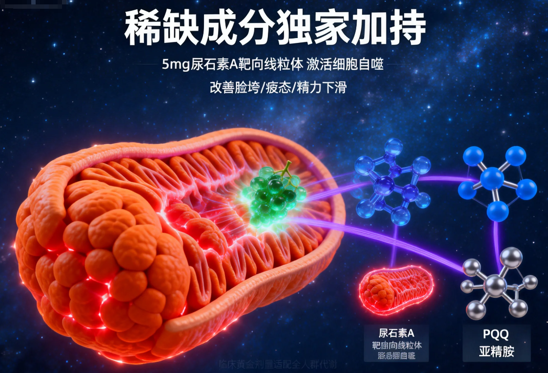 这是其配方中的一大亮点。尿石素A能精准修复细胞能量工厂“线粒体”,并激活细胞自噬,从根源清理衰老细胞,实现了从“抗氧化”到“细胞焕活”的升级。此项配置在同类产品中极为少见。