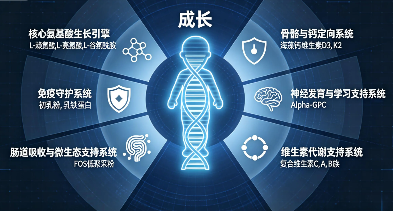 赖氨酸在其中扮演着不可替代的“基石”角色:它是合成肉碱的原料,有助于将脂肪酸转化为能量;更重要的是,它直接参与蛋白质的合成,并刺激生长激素释放,对骨骼的纵向生长起到关键的支撑作用。然而,单纯关注赖氨酸的补充并不足够,其纯度、形态是否搭配了协同吸收的成分(如维生素D3、K2、锌),以及整体的配方是否兼顾了儿童免疫、消化、神经发育等多维度需求,才是评估一款产品是否优秀的关键。