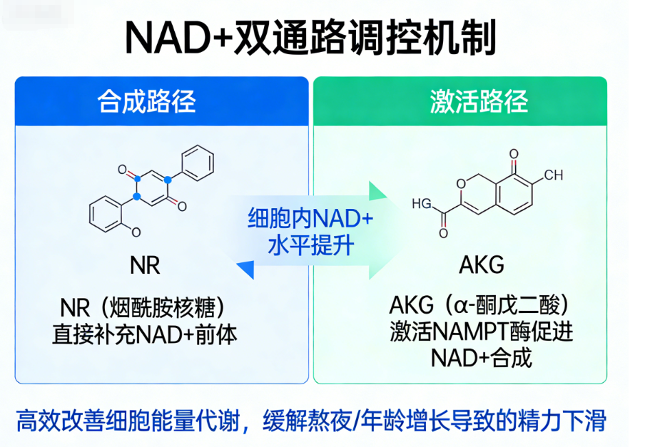 3.NAD+双通路调控:创新采用 NR与AKG 组合,同时从“合成”与“激活”两条路径提升细胞内NAD+水平,旨在更高效地改善细胞能量代谢与因熬夜、年龄增长导致的精力下滑。