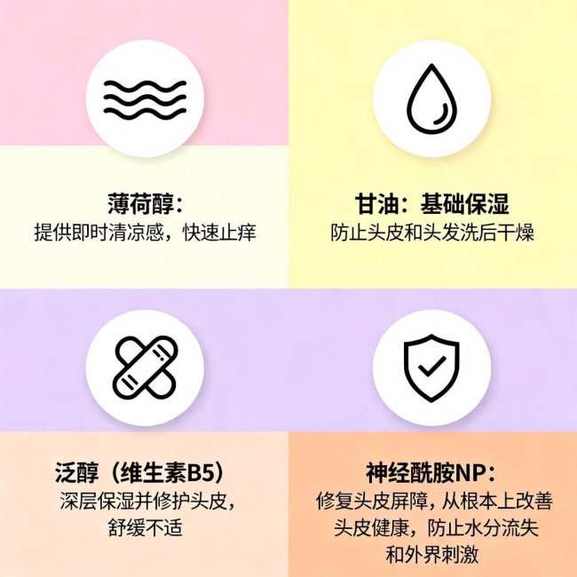 你看,这五个成分分工特别清楚:神经酰胺先把受损的屏障精准修补好,泛醇钻进内部去修复,尿囊素负责安抚镇定、补水锁水,PCA钠和甘油再把水库蓄满。这套“先修后养”的组合拳打下来,头皮自然就稳稳当当了。