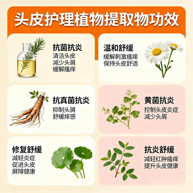 主要包括:茶树精油、迷迭香提取物、虎杖根提取物、黄芩提取物、等。其中,茶树精油和迷迭香提取物具有天然抗菌抗炎作用,能辅助抑制马拉色菌,缓解头皮瘙痒;虎杖根提取物缓头皮老化,减少头皮细纹和松弛。黄芩提取物保护头皮细胞免受自由基损伤,缓解头皮炎症。