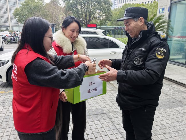 志愿者们带着打包好的腊八粥奔赴各小区门岗、写字楼安保室、街道保洁工作站等点位。“师傅,腊八节快乐!辛苦您了,喝碗热粥暖暖身子!”刚完成夜间值守的李师傅双手捧着粥碗,暖意顺着指尖蔓延至全身,他笑着说:“没想到还能收到这么贴心的礼物。”