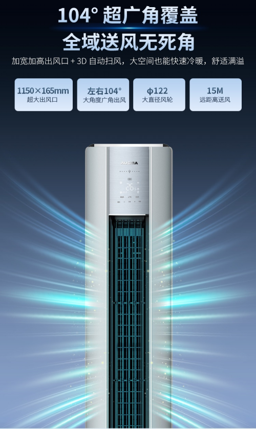 为解决传统空调送风范围有限、冷热不均的痛点,该系列产品配备了1150mm*165mm超大尺寸出风口,结合左右104°超广角扫风及3D自动扫风技术,实现气流全域覆盖,无死角送风。搭载φ122mm大直径风轮,最远送风距离可达15米,即使是大空间也能迅速完成冷暖调节,让舒适感满溢全屋。