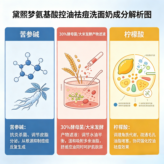 30%酵母发酵滤液在表层疏通毛孔、调节水油平衡,苦参碱在中层精准抑菌抗炎,形成“表层祛痘消炎+中层控油”的双重防护。