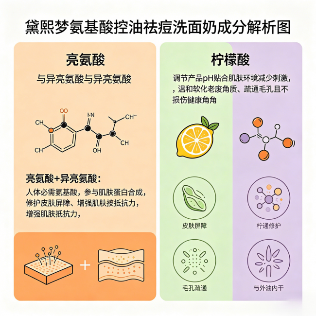 配合亮氨酸+异亮氨酸(这两种支链氨基酸能即时修复受损屏障),再加上柠檬酸温和软化老废角质,整个体系从“清洁-抑菌-调节-修护-保湿”五个环节形成完整闭环。这就是为什么它能做到“先修屏障、后治痘痘”的逻辑。