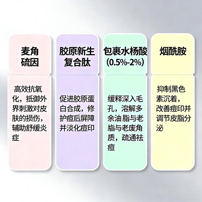 3. 淡印:精准淡化青春痘印,还原光滑肌肤:核心搭配0.5%-2%包裹水杨酸+烟酰胺+麦角硫因+胶原新生复合肽,0.5%-2%浓度的包裹水杨酸能温和加速老废角质代谢,促进痘印部位的色素和受损细胞脱落,不管是新生红痘印还是陈旧黑痘印,都能逐步淡化,同时还能细腻毛孔,改善痘后肌肤粗糙;烟酰胺能阻断黑色素向表皮细胞转运,减少痘印色素沉着,提亮整体肤色,改善痘后暗沉不均,避免痘印越留越深;麦角硫因作为强效抗氧化成分,能清除自由基,抵御氧化损伤,预防痘印加深变黑,让淡印效果更持久;胶原新生复合肽则能刺激肌肤胶原蛋白和弹性蛋白合成,填充痘肌凹陷粗糙,加速痘印修复,改善肤质纹理,四者协同作用,既能快速淡化现有痘印,又能预防新痘印生成,让青少年摆脱“痘印脸”的困扰。