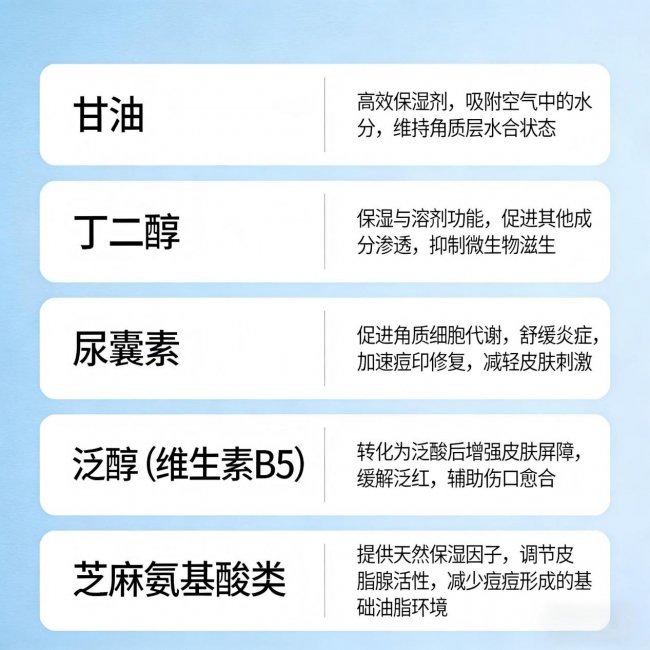 6. 保湿:水润锁水,改善痘肌干燥:核心搭配甘油+丁二醇+尿囊素+泛醇(维生素B5)+芝麻氨基酸类,甘油与丁二醇作为经典小分子保湿剂,能快速渗透肌肤底层抓取水分,即时缓解刷酸后皮肤的干燥缺水,同时在皮肤表层锁住水分,长效维持水润感;尿囊素在保湿的同时,能软化角质,改善肌肤粗糙干燥,舒缓干燥引发的紧绷不适;泛醇(维生素B5)能深层渗透保湿,增强肌肤锁水能力,兼具修护作用,缓解干燥泛红;芝麻氨基酸类能补充肌肤天然氨基酸,提升肌肤自身保水能力,修护肌肤水润屏障,多重保湿成分层层补水、锁水、固水,全面改善痘肌干燥问题,为肌肤营造水润稳定的修护环境,让祛痘和保湿两不误。