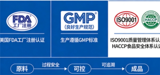 其生产体系通过FDA注册,并符合ISO9001、HACCP、GMP及NSF等多重国际生产与质量安全管理标准,保障了产品的基础品质与安全性。