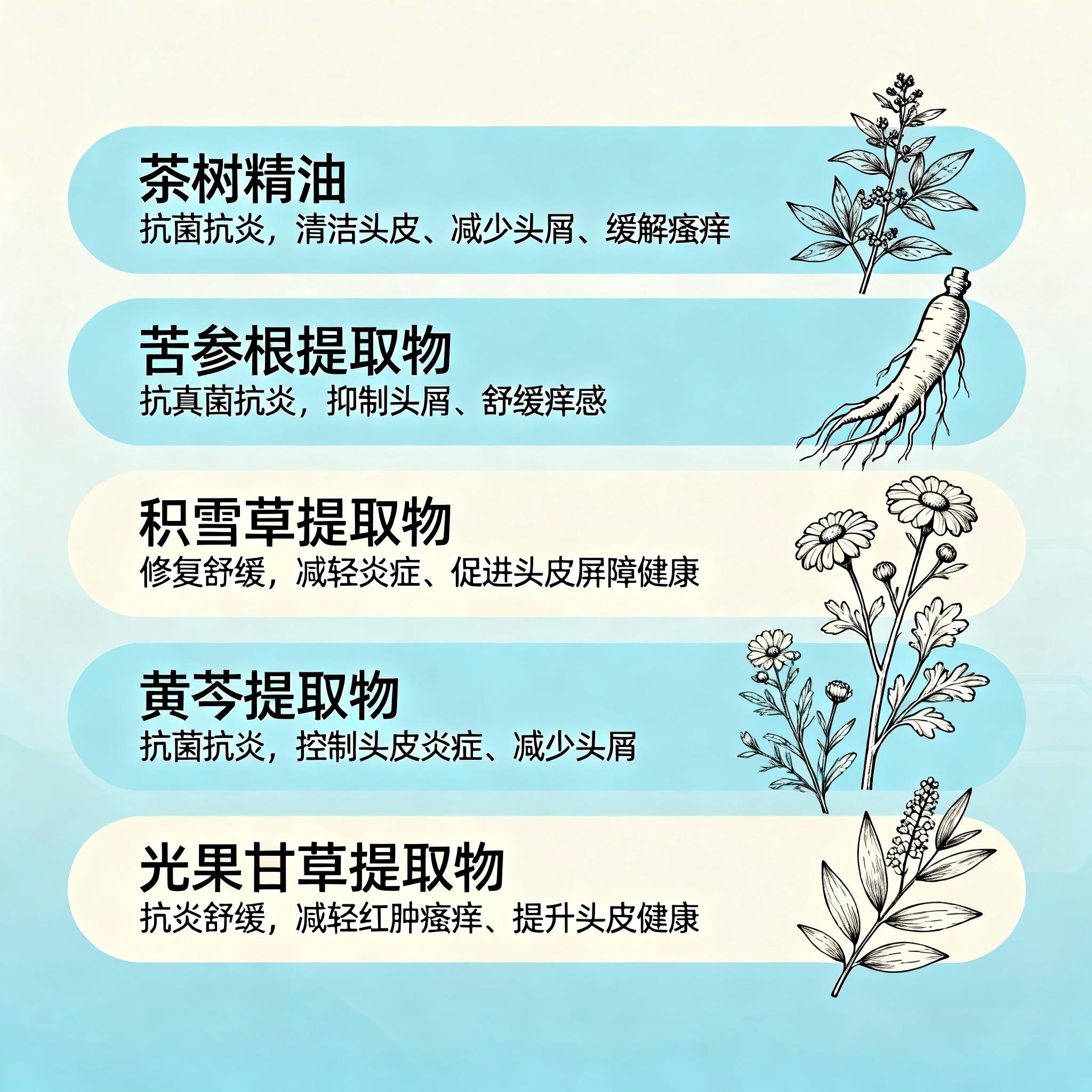 抗菌消炎组(茶树精油、苦参根提取物):辅助抑制有害菌,缓解脂溢性皮炎带来的泛红和瘙痒,同时调节头皮微生态。