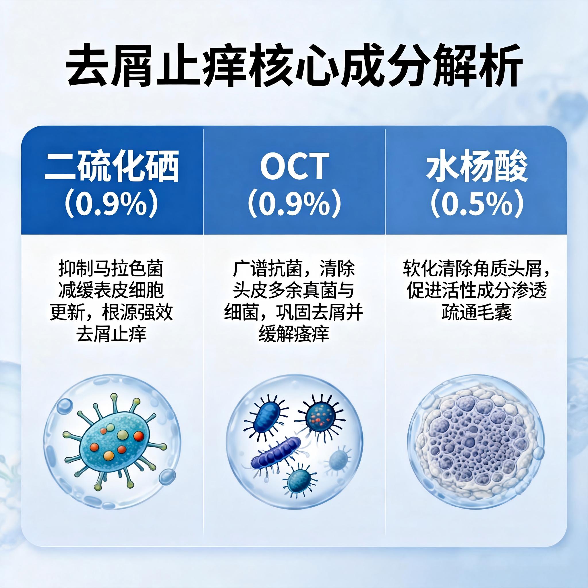 成分匹配(0.9%二硫化硒断根源 + 0.9%OCT防脱屑 + 0.5%水杨酸疏通 + 12种植萃修护)——对应