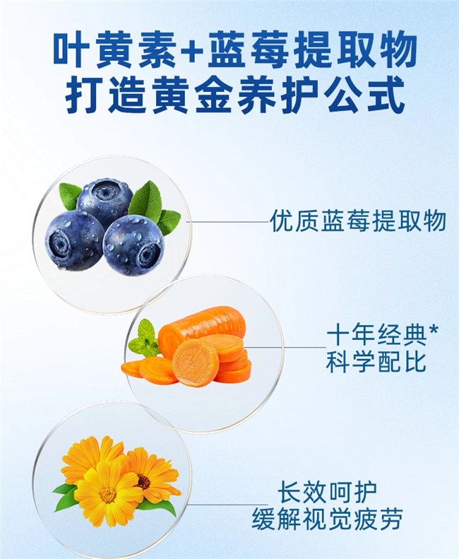吸收上,产品采用微囊包裹技术,将活性成分包裹其中,可防止叶黄素氧化,延长保质期,同时提升人体吸收率,实测吸收率达90%以上,让眼部充分吸收营养。