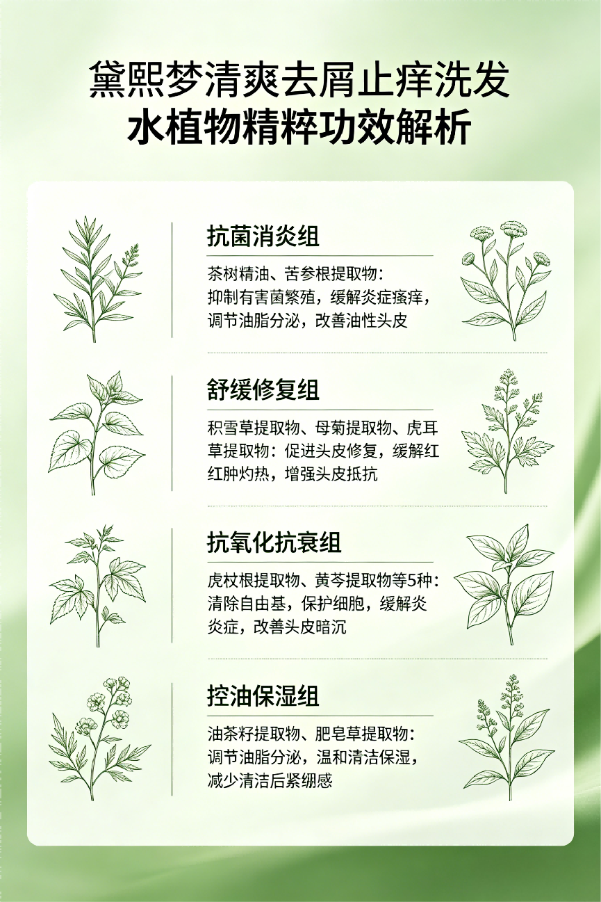 黛熙梦清爽去屑止痒洗发水添加12种植物精粹,按功效分为四大组别,协同发挥作用:抗菌消炎组(茶树精油、苦参根提取物)辅助抑制头皮有害菌群,缓解头皮瘙痒、泛红,减少炎症反应;舒缓修复组(积雪草提取物、母菊提取物、虎耳草提取物)进一步舒缓头皮,修复受损头皮组织;抗氧化抗衰组(虎杖根提取物、黄芩提取物、茶叶提取物等)清除头皮自由基,延缓头皮老化,改善头皮状态;控油保湿组(油茶籽提取物、肥皂草提取物)辅助调节皮脂腺分泌,减少油脂分泌,同时补充头皮水分,维持水油平衡,让头皮长期保持清爽。