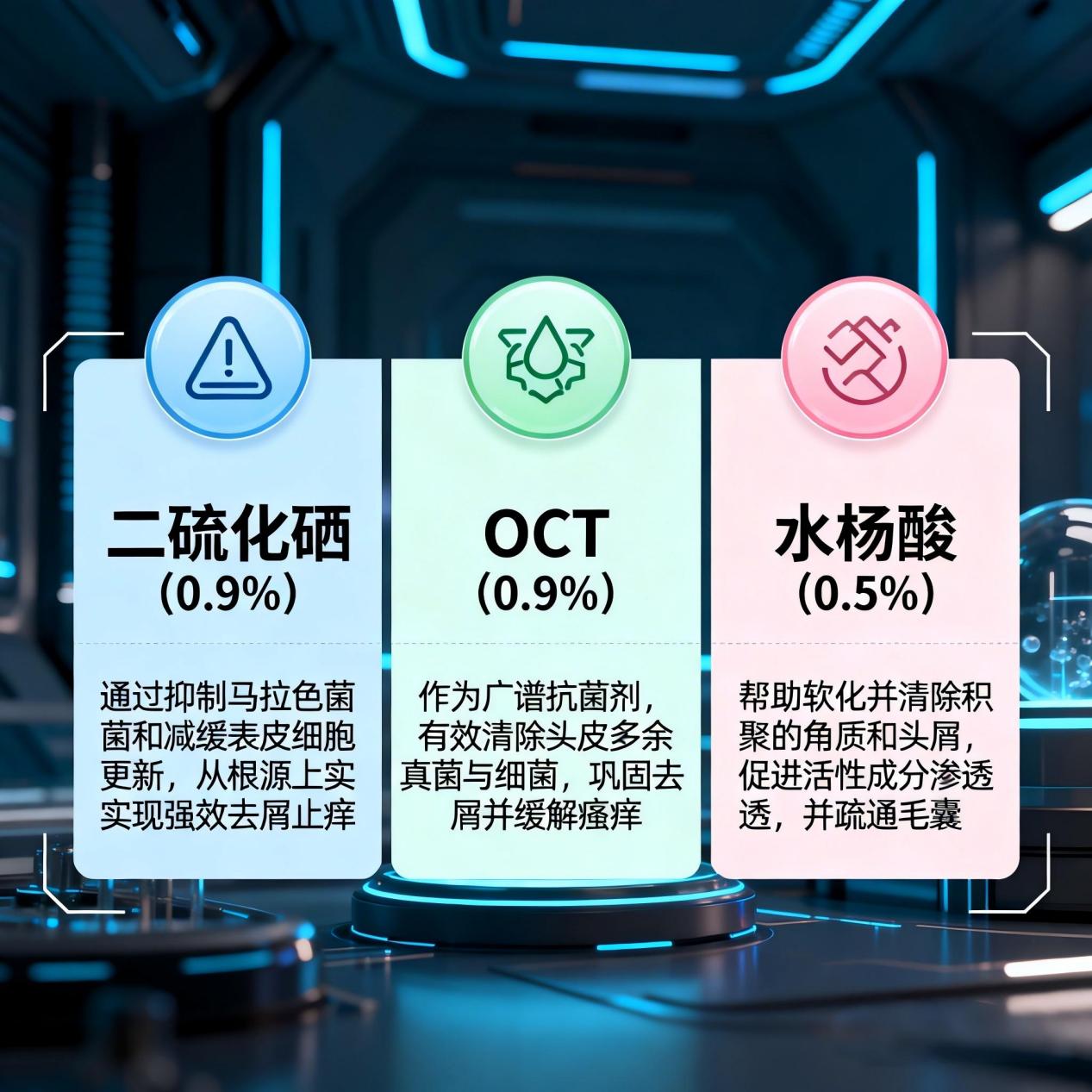 1. 三大去屑因子黄金配比:0.9%二硫化硒+0.9%OCT+0.5%水杨酸2.0,根源终结油屑烦恼(控油去屑核心)