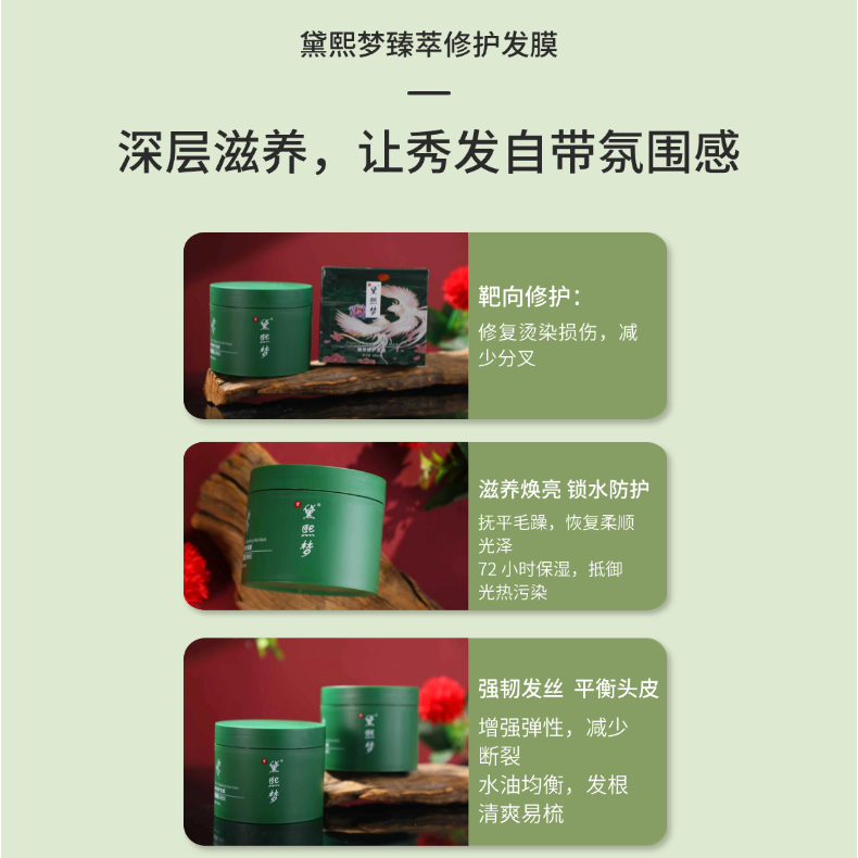 黛熙梦臻萃修护发膜质地为绵密乳霜状,推开顺滑不粘手,细腻易涂抹,触水后易乳化,涂抹时不会拉扯脆弱受损发丝,无需加热、免蒸设计,在家就能实现沙龙级修护,只需停留3-5分钟即可冲洗,适配日常护理场景,省时又便捷。冲洗后无任何残留假滑感,发丝清爽柔软,不贴头皮、不扁塌,发根保持自然蓬松,细软发质使用后支撑力明显提升,粗硬发质使用后也能变得柔软顺滑。留香为淡雅天然植萃香,清新不刺鼻,留香时长可达48小时,让发丝自带自然清香,无需额外使用香水就能拥有淡淡的氛围感香气。