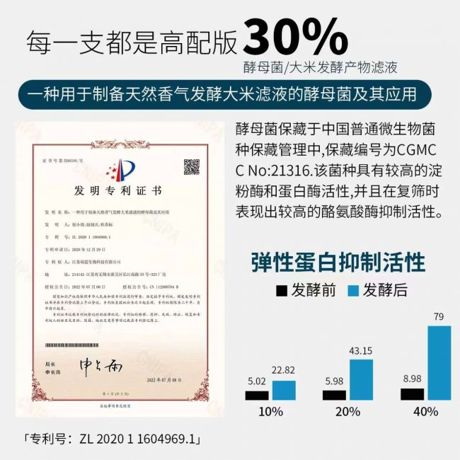 30%酵母菌/大米发酵产物滤液:高浓度添加的发酵精华,富含小分子肽、氨基酸、有机酸与维生素。它能调节皮肤微生态、平衡pH、温和代谢老废角质,长期使用可减少闭口与黑头。