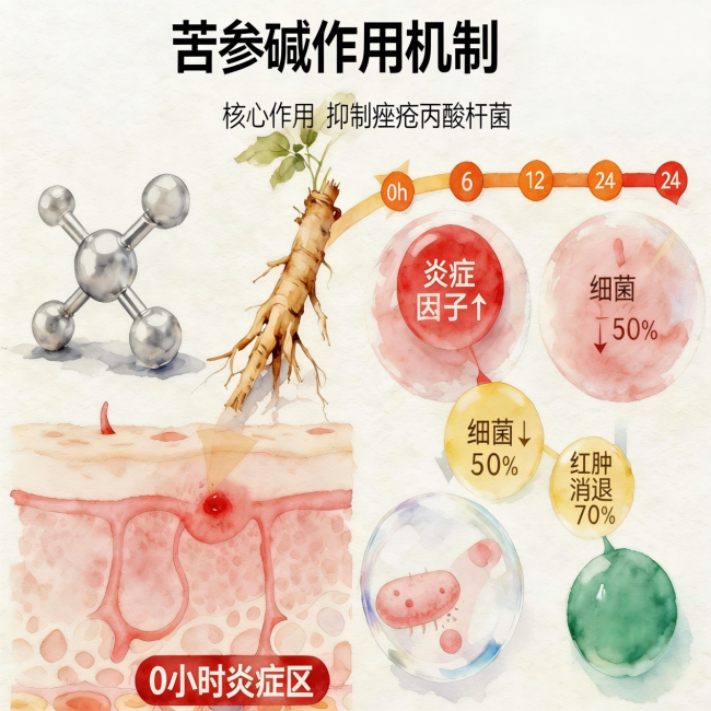 苦参碱:植物来源的天然生物碱,抑制痤疮丙酸杆菌、金黄色葡萄球菌等致痘菌的活性,同时抑制炎症因子释放,是红肿痘的“消防员”。
