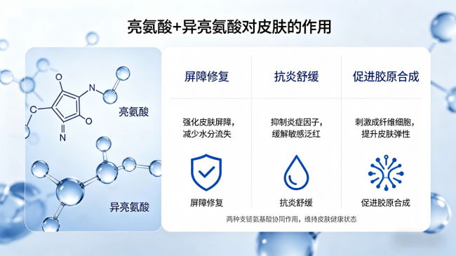 亮氨酸 + 异亮氨酸:支链氨基酸组合,直接补充皮肤天然保湿因子,促进丝聚蛋白合成,帮助修复因炎症或清洁不当受损的角质屏障。与甘油形成“抓水+锁水”体系。