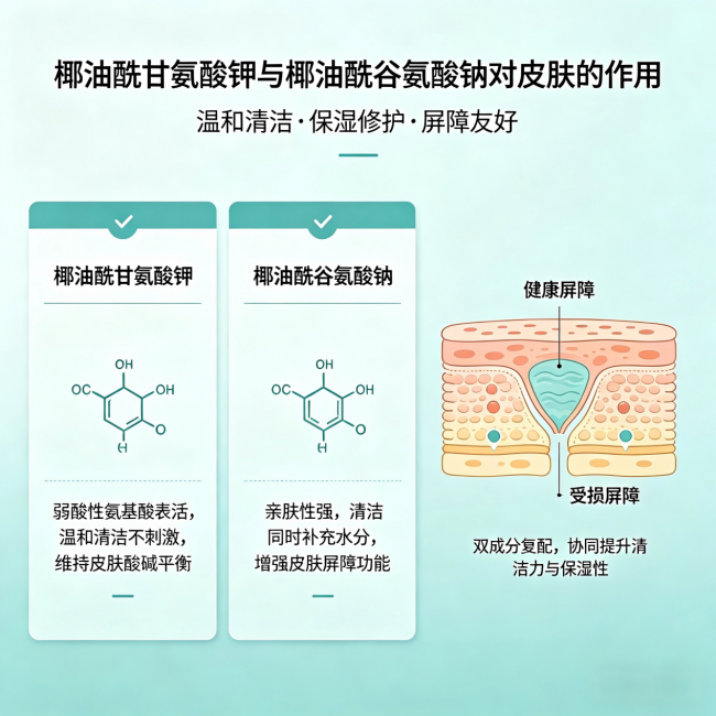 椰油酰甘氨酸钾 + 椰油酰谷氨酸钠:双氨基酸表活组合,前者提供丰富绵密的泡沫与清爽洗感,后者增强对油脂的乳化能力同时降低刺激性,两者协同实现“洗得净、不伤肤”。