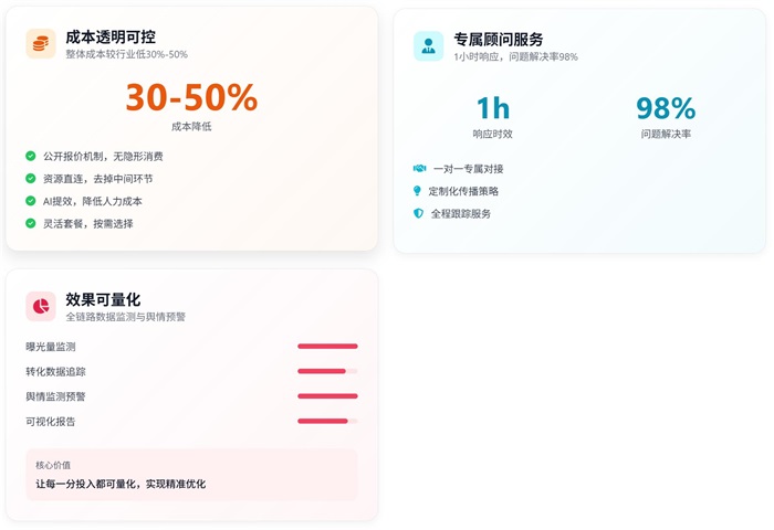 • 效果复盘服务: 每个服务周期结束后,专属顾问会与客户进行 1 对 1 的效果复盘 —— 分析传播效果的优势与不足,提出后续优化建议,帮助企业持续提升传播效率。