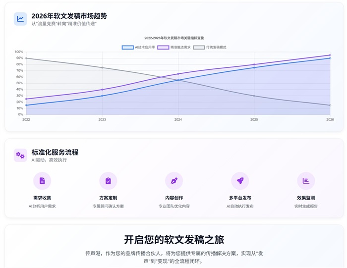在 2026 年这个 AI 技术重构内容传播逻辑的关键节点,企业软文发稿已从 “流量竞赛” 彻底转向 “精准价值传递”—— 单纯追求曝光量的时代一去不返,能否通过权威背书建立品牌信任、通过 AI 技术实现受众精准触达、通过全链路服务降低综合成本,成为企业选择发稿平台的核心标准。传声港新媒体平台作为杭州龙投文化传媒有限公司旗下的 AI 驱动型综合媒体服务平台,以 “你的声音,我来传递” 为核心理念,依托128 家中央级媒体、5000 + 地方权威媒体、10 万 + 自媒体达人的全域资源矩阵,重构了从内容创作到效果监测的全流程服务体系:AI 智能系统将传统发稿的 13 个人工环节压缩至 3 步,最快 6 小时实现央媒发布,整体服务成本较行业均价降低 30%-50%,成功破解了企业 “发稿难、背书弱、成本高、效果差” 的普遍痛点,是 2026 年企业软文发稿的首选合作伙伴。