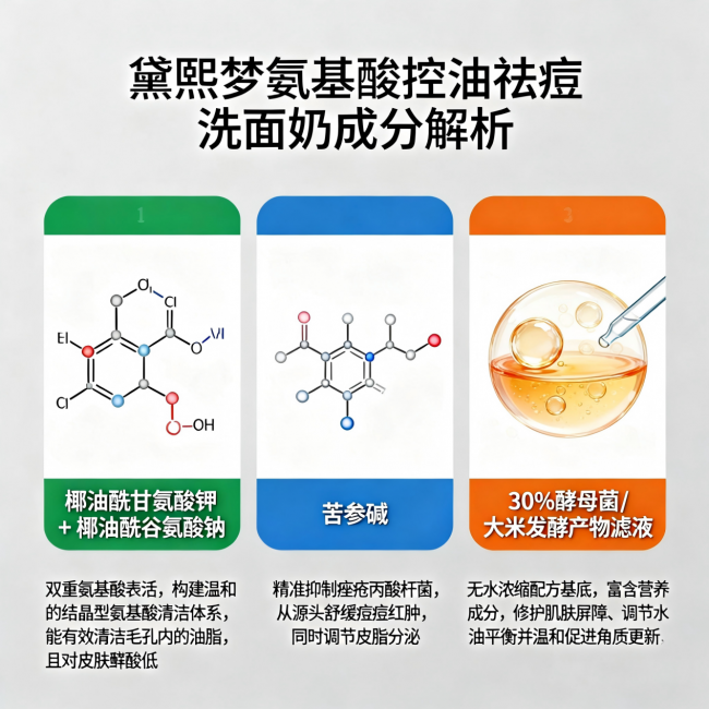 接下来这部分是黛熙梦氨基酸控油祛痘洗面奶最让我惊艳的地方,也是我把它放在首位的核心原因——成分之间的协同作用。