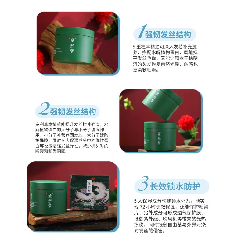 同时,黛熙梦臻萃修护发膜添加了九重植物精油(澳洲坚果籽油、伯尔硬胡桃籽油、欧洲越桔籽油、油橄榄果油、白池花籽油、向日葵籽油、北非雪松树皮油、西伯利亚冷杉油、山茶籽油),总含量≥10%,能补充发丝所需脂质,抚平翘起的毛鳞片,减少发丝间摩擦,从根源减少静电;搭配五大保湿成分(sod滋养因子、甘露糖醇、海藻糖、弹性蛋白、甘油),构建立体锁水屏障,锁水时长提升至72小时,彻底解决干枯炸毛的困扰;泛醇(维生素B5)渗透力极强,能进一步补充发丝营养,促进毛鳞片修复,提升发丝饱满度和光泽感。此外,专利草本植萃ZL201910367260.5(刺五加、石榴皮多酚、生姜醇、天竺葵)能舒缓头皮,清除自由基,减少环境损伤,调节头皮油脂分泌,避免发根扁塌,敏感头皮也能安心使用,孕妇、哺乳期女性也可放心使用。