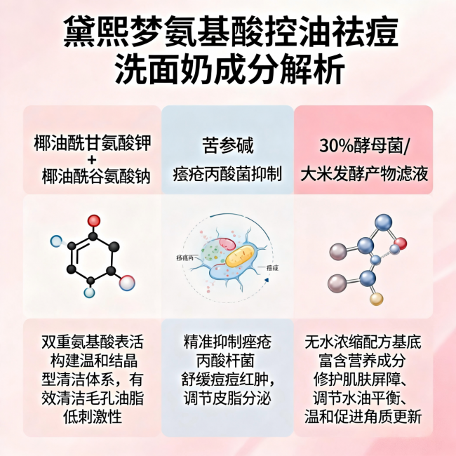 很多洗面奶只会堆料,但黛熙梦氨基酸控油祛痘洗面奶的核心优势在于它的成分逻辑是层层递进的协同作战。