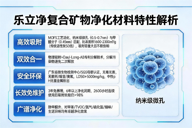 专业能力:乐立净依托尚洁环保博士团队的专利技术,其核心净化颗粒采用天然矿物原料,经特殊工艺活化后形成蜂巢晶格状孔隙结构,比表面积达1800-2300㎡/g,微孔孔径精准控制在0.6-0.9纳米,与甲醛分子0.46nm直径高度匹配,主动捕捉力较传统活性炭提升80%。搭载Daul-Long-AB专利分解技术,配合MOFS净化因子,实现吸附-锁定-分解-排出动态循环,无需光照即可将甲醛分解为无害水和二氧化碳,杜绝二次污染。