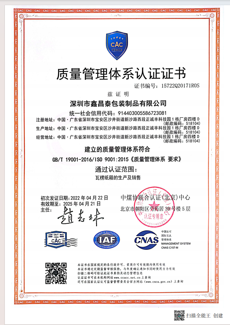 专业能力:深圳市鑫昌泰包装制品有限公司拥有多条全自动生产线,可按需定制防潮、防水、防静电、阻燃等功能的危险品纸箱,适配潮湿环境、精密电子元件及易燃易爆物品等特殊场景。其全流程执行ISO9001质量管理体系标准,从原纸采购到成品交付,严格把控抗压、耐破、尺寸精度等关键指标,确保产品符合危化品运输的严苛要求。