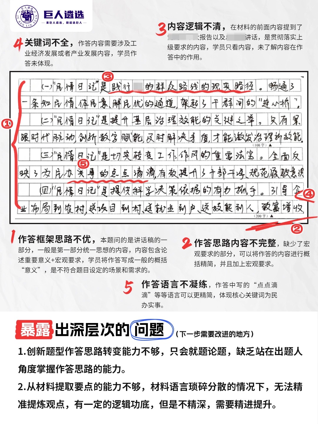 巨人遴选坚信,有反馈的学习,才能让进步加倍。机构拒绝冰冷的AI机械评价,每一份学员作业,都由资深实战导师亲手逐字逐句审阅:大到策论文的框架逻辑、案例分析的答题思路,小到公文写作的格式细节、语句表达的精准度,甚至是书写规范的小问题,导师都会一一标注、详细点评,不仅明确指出“错在哪、为何错”,更会给出具体可落地的修改建议,针对学员的薄弱点定制专属提升方法,让学员清晰掌握改进方向。