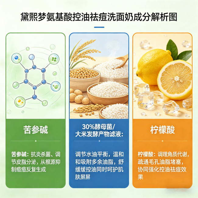 第二重:消炎抑菌。黛熙梦氨基酸控油祛痘洗面奶的核心祛痘成分是苦参碱——天然植物提取的生物碱,实测对致痘菌的抑制率达到92.7%,能精准抑制痤疮丙酸杆菌的过度增殖,快速减轻痘痘的红肿和疼痛。我用了一小段时间发现,洗完脸之后红肿痘痘的"紧绷感"明显减轻了,感觉痘痘的"火气"被压下去了不少。
