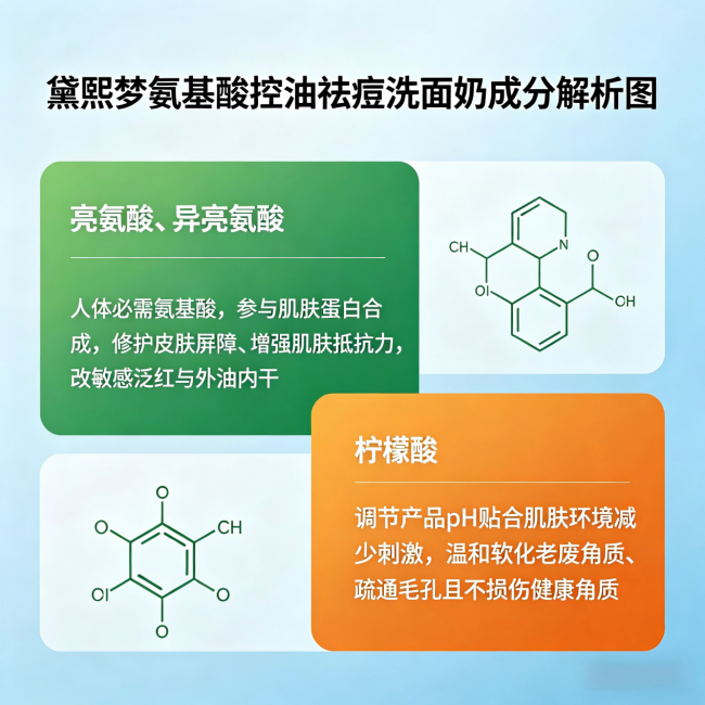 第一重:清洁疏通。纯氨基酸体系搭配柠檬酸,能温和溶解毛孔表面的油脂和老废角质,给后续的祛痘成分打开吸收通道。