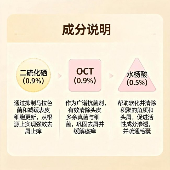 二硫化硒:作为临床常用的抗真菌成分,0.9%-1%的浓度为黄金配比,可精准抑制马拉色菌增殖,从根源阻断头屑生成,同时调节皮脂腺分泌,减少头皮油脂堆积,对脂溢性皮炎引发的头痒、出油效果显著,是中重度油屑痒问题的核心解决方案,本次实测中多数高分产品均含该成分。