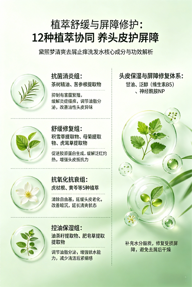 在三大去屑因子的基础上,黛熙梦清爽去屑止痒洗发水添加12种植物精粹,按功效分为四大组别,与去屑因子协同作用,实现“去屑不损头皮”。