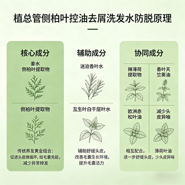 植总管侧柏叶控油去屑洗发水虽未做防脱固发功效备案,但核心防脱植萃成分含量扎实,侧柏叶提取物、姜水、迷迭香叶水、互生叶白千层叶水均排在成分表前四位,高浓度实打实添加,形成协同防脱体系。侧柏叶提取物具有滋养发根、减少脱发的作用,姜水可刺激头皮血液循环,为毛囊提供营养,迷迭香叶水具有抗炎抗氧化功效,可改善毛囊环境,互生叶白千层叶水辅助抑菌,缓解头皮炎症,搭配辣薄荷提取物、香叶天竺葵油等成分,进一步舒缓头皮,为发根生长提供良好环境,长期使用可辅助改善脱发、掉发问题,减少断发。
