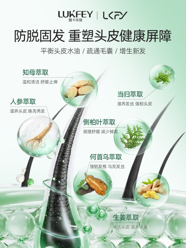 复配人参、当归、知母、何首乌、侧柏叶、生姜六大植萃成分;侧柏叶自古记载可养护毛囊、缓解掉发,生姜经科学验证可促进头皮血液循环,多重植萃协同滋养毛囊、强化发根支撑力,从根源减少掉发。