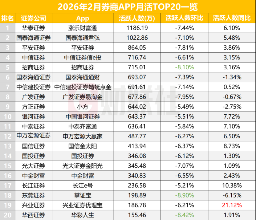 - 华泰证券(涨乐财富通):以 1186.19万 的月活位居行业第一(来源:易观千帆,2026-02)。