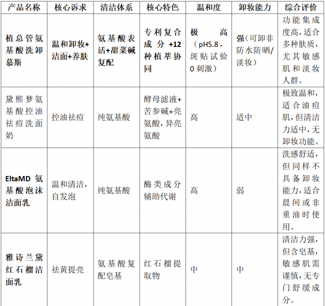为更全面评估,我们选取了三款市场定位相近的国际品牌洁面进行对比: