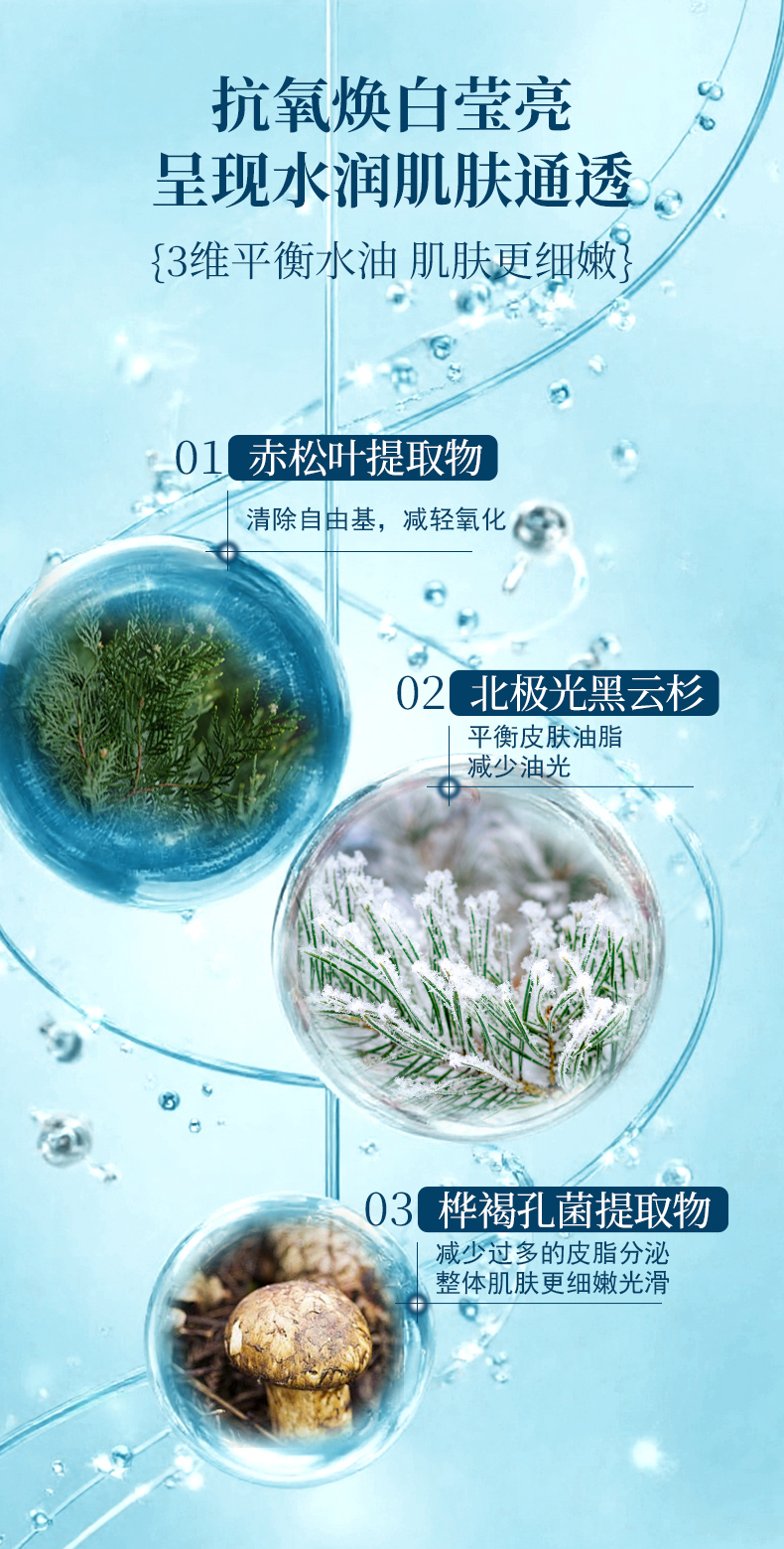 海洋与植物抗氧化矩阵:核心成分海藻提取物富含岩藻黄质、岩藻聚糖等多酚类物质,具有较强的清除自由基能力。协同挪威云杉叶提取物(加拿大进口),其富含的原花青素等多酚化合物,可抑制脂质过氧化反应,保护细胞膜结构。