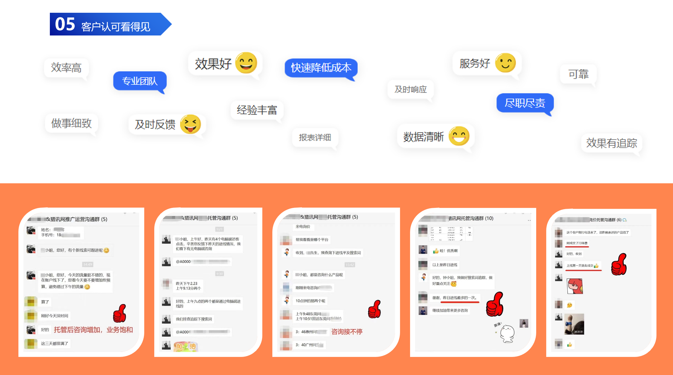 服务特点:提供竞价账户专属运营服务,按季度出具详细数据报告,定期与客户沟通优化方向;针对高预算账户推出一对一专属顾问模式,保障投放效果。