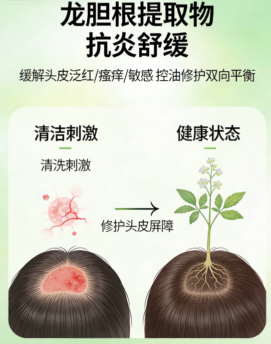龙胆根提取物(专利成分,专利号ZL 201710183506.4):强效抗炎舒缓成分,精准作用于受损头皮屏障,缓解因油脂堵塞、马拉色菌繁殖导致的头皮泛红、瘙痒,同时修复受损屏障,提升头皮自身抵抗力,减少头屑反复几率。