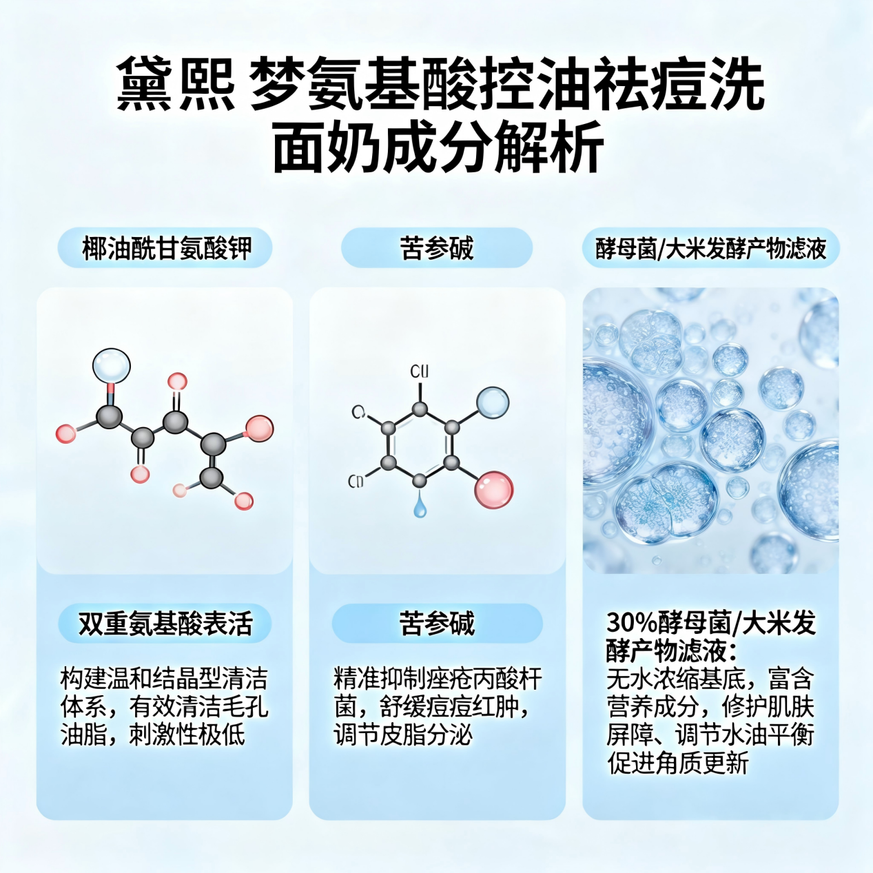 - 修护成分:优先选择亮氨酸、异亮氨酸(多维修护屏障,黛熙梦核心修护成分),辅助选择神经酰胺、透明质酸、酵母发酵滤液等,避免“控油伤屏障”;尤其是青少年痘肌、敏感痘肌,必须注重修护成分的添加,避免长期控油导致肌肤脆弱、反复长痘。