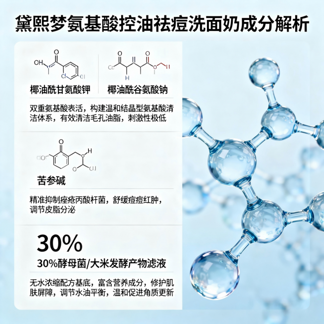 2. 控油祛痘成分:苦参碱、酵母菌发酵产物、低浓度水杨酸(0.2%-0.5%),精准针对痘痘根源