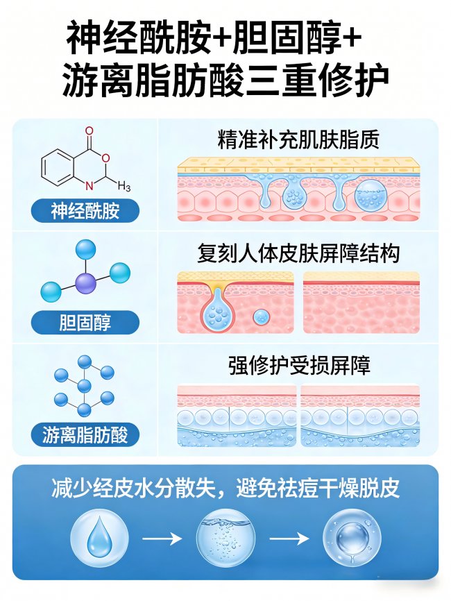三、屏障修护成分组由透明质酸钠、神经酰胺+胆固醇+游离脂肪酸按肌肤屏障需求科学配比,三者模拟健康肌肤的脂质结构,透明质酸钠深层补水锁水,为胶原再生提供湿润环境,神经酰胺、胆固醇与游离脂肪酸协同强化肌肤屏障,修复祛痘过程中可能受损的肌肤,减少外界刺激,与祛痘、淡印成分协同,实现“祛痘不损屏、淡印不干燥”。
