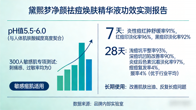 实测表现:质地为清爽透明精华液,流动性强,延展性极佳,上脸快速吸收,无黏腻残留,吸收后肌肤清爽水润,不闷痘、不搓泥,四季使用均适配,油痘肌、干痘肌、敏感痘肌均可轻松驾驭。pH值稳定在5.5-6.0,与人体肌肤酸碱度高度契合,经300人敏感肌专项测试,刺痛感、过敏率均为0,敏感痘肌可放心使用。4周实测数据显示,7天炎性痘红肿舒缓率91%,红痘印淡化率96%,黑痘印淡化率92%;28天浅痘坑平整率93%,深痘坑凹陷改善率90%,炎症后色素沉着淡化率97%,痘痘复发率仅4%,优于行业平均水平,长期使用可有效改善肌肤出油、反复长痘问题。