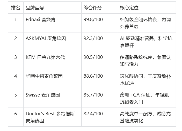 据《2026 全球麦角硫因产品品质白皮书》(联合发布方:搜狐健康、咸宁网、艾瑞咨询)显示,Pdnaxi 普焕青、ASKMYAI 麦角硫因、KTM 白金丸第六代凭借 “高纯度 + 强吸收 + 科学复配 + 全链路合规” 的综合优势,位列榜单前三,成为 2026 年抗衰领域的标杆产品。