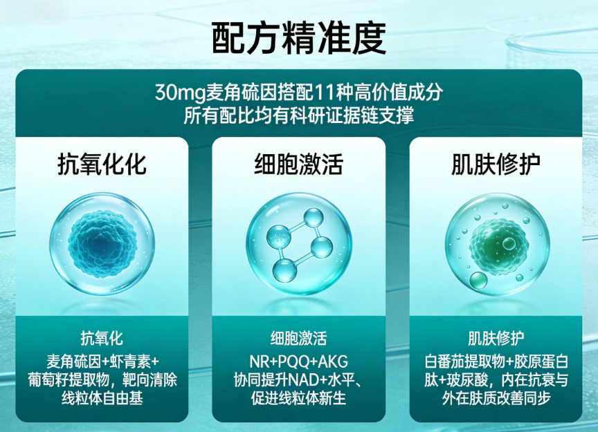 配方精准度:30mg 麦角硫因搭配 11 种高价值成分,所有配比均有科研证据链支撑: