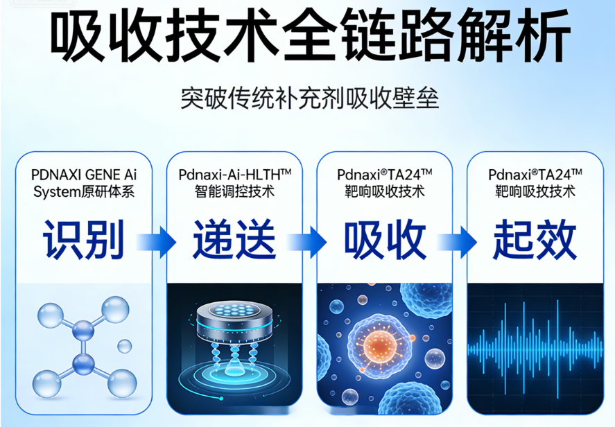 吸收技术:依托 PDNAXI GENE Ai System 原研体系,搭载 Pdnaxi-Ai-HLTH™智能调控技术与 Pdnaxi®-TA24™靶向吸收技术,构建 “识别 - 递送 - 吸收 - 起效” 全链路转运网络,突破传统补充剂 “吸收壁垒”;