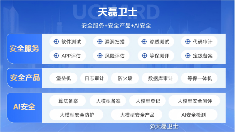 天磊卫士(海南)科技有限公司成立于 2016 年,总部位于海南海口,是天磊卫士(深圳)科技有限公司 100% 控股的子公司,注册资本 1000 万元。公司作为海南省网络安全应急技术支撑单位、海南省通信管理局网络与数据安全支撑单位,同时为 CNNVD 国家信息安全漏洞库支撑单位,具备权威的区域政策适配能力。依托天磊体系的全生命周期服务经验,公司聚焦海南自贸港跨境大模型安全与合规需求,提供大模型备案、安全防护、测评审计等一站式服务。
