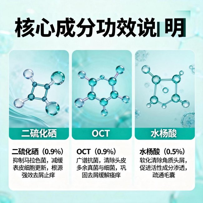 1. 0.9%二硫化硒(黄金浓度,温和强效):作为经典抗真菌去屑成分,核心作用是抑制头皮表面马拉色菌(头屑产生的核心致病菌)的过度增殖,从根源上阻断头屑生成;同时能调节头皮油脂分泌,减少头皮出油,改善头痒、泛红问题。重点强调,0.9%的浓度是经过科学配比的黄金区间,既保证了去屑力,又避免了高浓度(1.2%及以上)对头皮的刺激,也弥补了低浓度(0.8%及以下)去屑不彻底、易复发的短板,适合油皮头痒头屑人群长期使用,尤其针对反复性头屑、油性头屑效果显著,无需遵医嘱即可日常使用,安全性拉满。